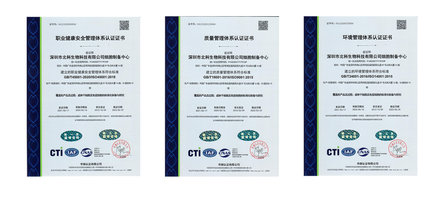 北科生物是國內較早在細胞生物醫(yī)藥領域引入質量管理概念的企業(yè),于2010年首次進行了ISO9001質量管理體系認證,并于2012年整合體系完成“質量、環(huán)境、職業(yè)健康安全”三標一體認證。同時北科生物江蘇分公司是中國大陸首家引入并通過“血液和生物治療發(fā)展協(xié)會”((Association for the Advancement of Blood & Biotherapies,簡稱AABB,原美國血庫協(xié)會)認證的綜合性細胞庫。2017年5月,北科生物深圳細胞庫(深圳綜合細胞庫)的四項自體細胞(人臍帶來源間充質干細胞、人臍血來源造血干細胞、人胎盤來源間充質干細胞、人外周血免疫細胞)儲存應用技術質量管理體系同時通過AABB認證,標志著北科生物已經建立起細胞制備、儲存及臨床轉化應用服務的整合型技術管理模式。