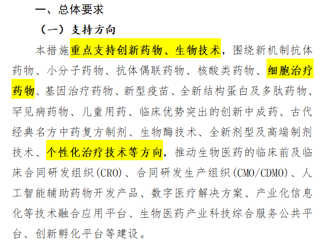 《措施》總體要求,重點(diǎn)支持創(chuàng)新藥物、生物技術(shù),圍繞…細(xì)胞治療藥物、基因治療藥物、新型疫苗……個(gè)性化治療技術(shù)等方向的發(fā)展。